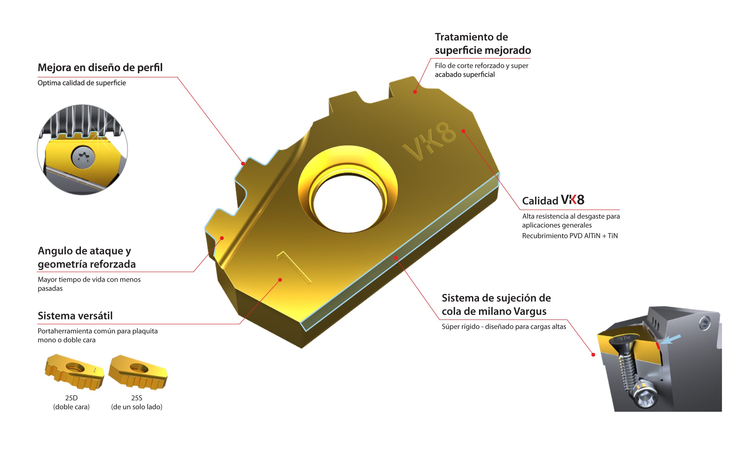 • Sistema versátil - Permite el montaje de plaquitas de único y de doble filo de corte en el mismo portaherramientas